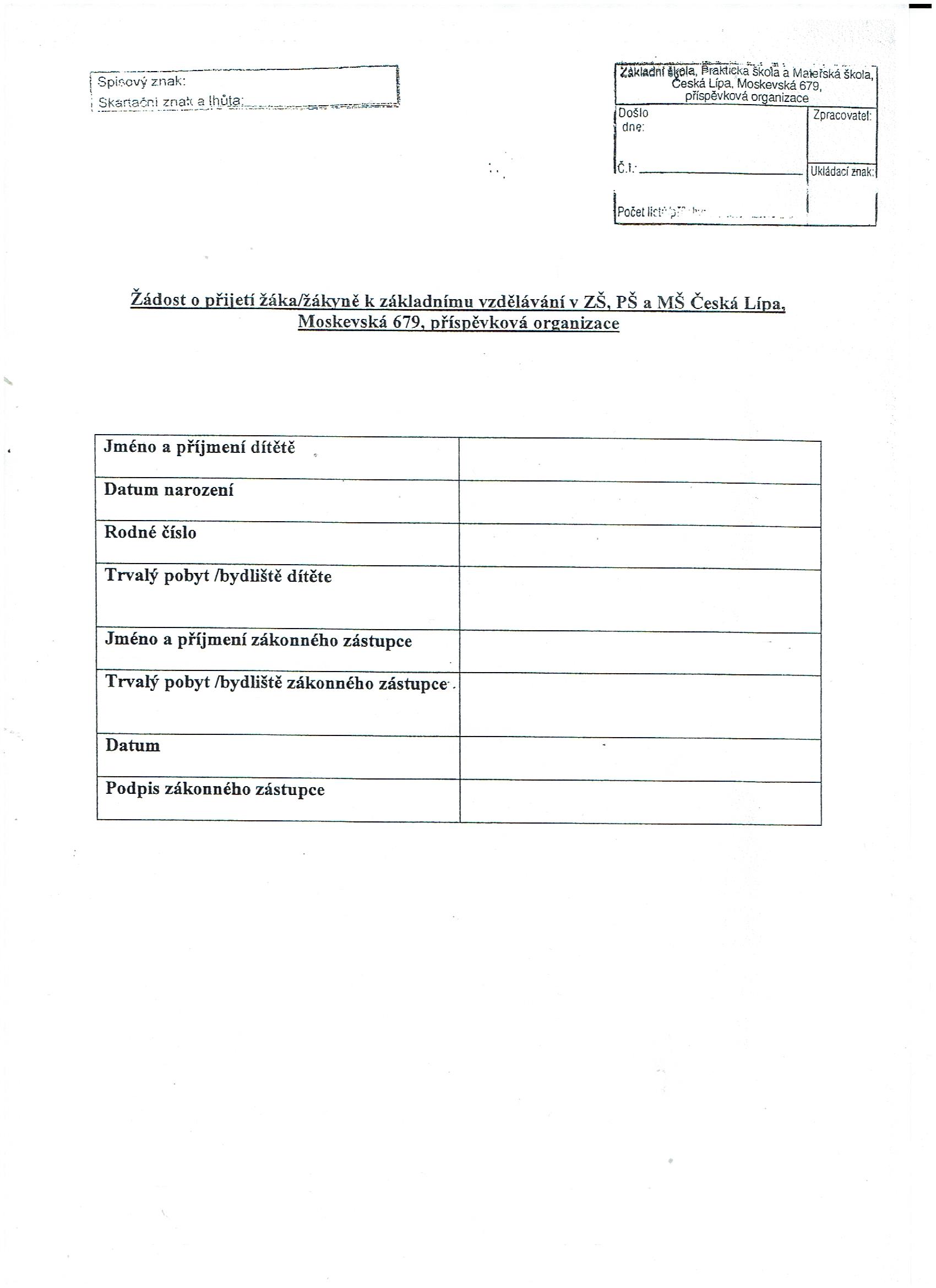 Žádost o přijetí dítetě k základnímu vzdělávání